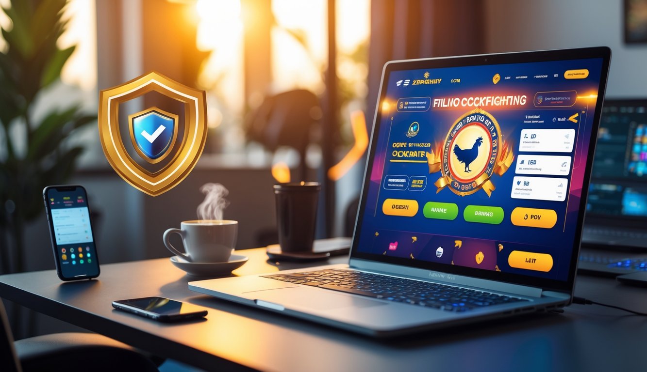 Seorang pengguna duduk di depan laptop yang menampilkan situs sabung ayam Filipina dengan elemen keamanan dan bonus menarik di meja kerja yang rapi.